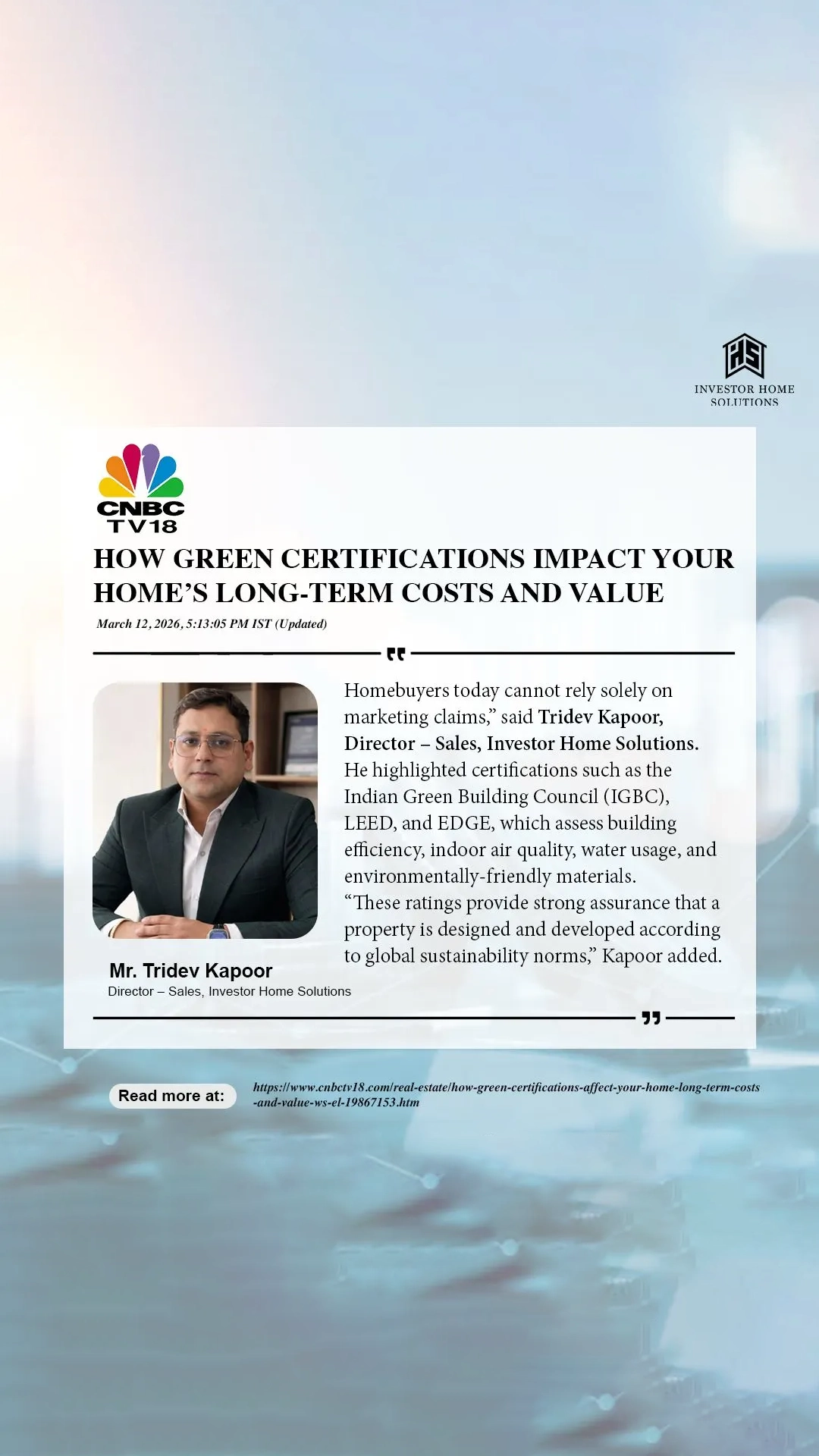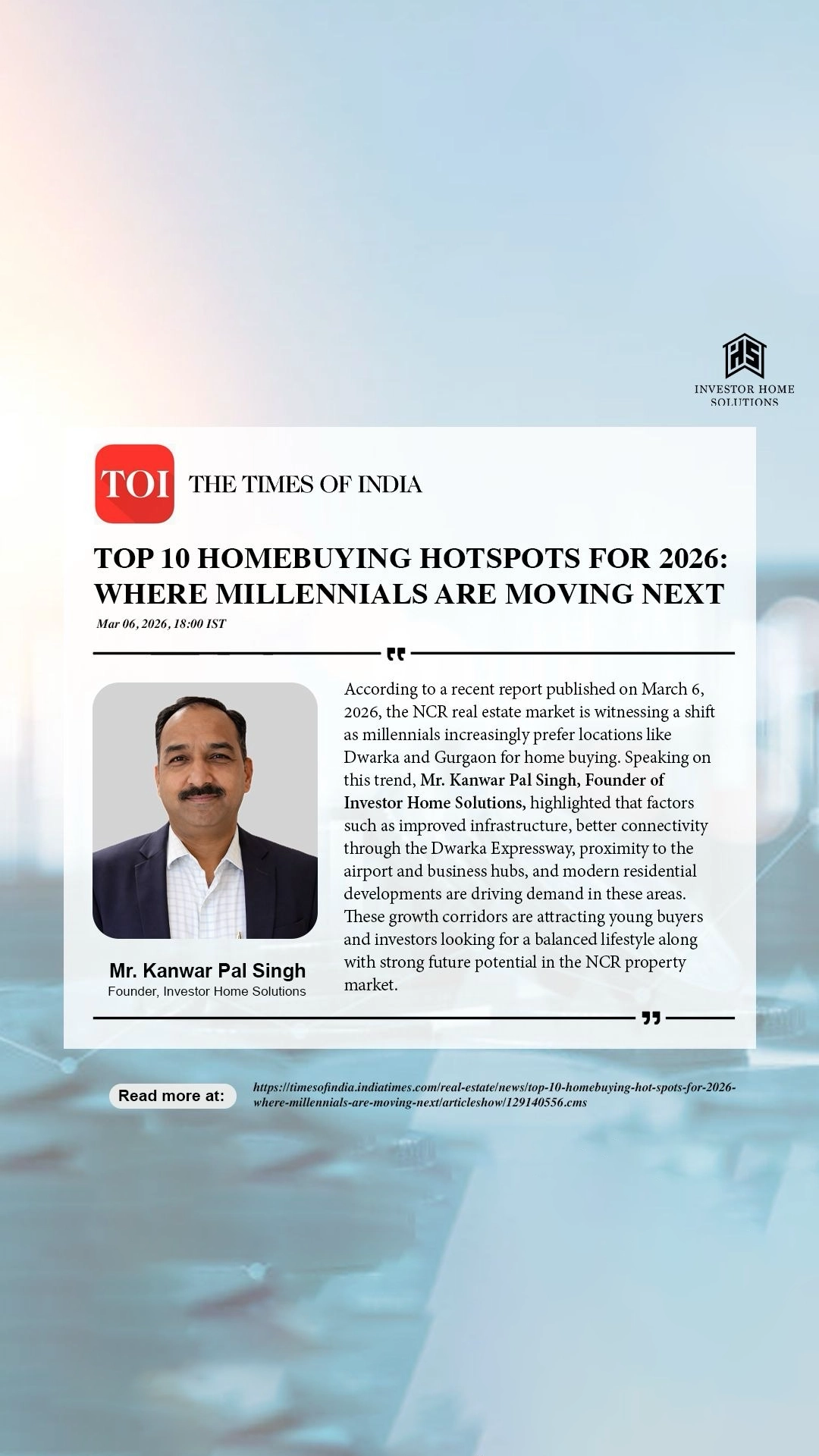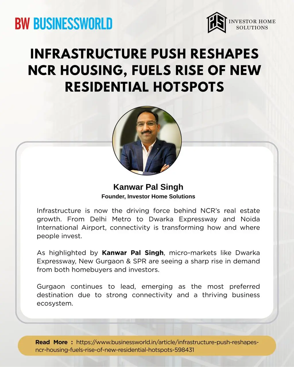 As a trusted voice in the property investment sector, Mr. Kanwar Pal Singh regularly shares expert analysis on market trends, investment strategies, and the evolving Gurgaon real estate landscape. His insights have been featured in leading publications such as Times of India, Hindustan Times, News18, Business Standard, and ANI.